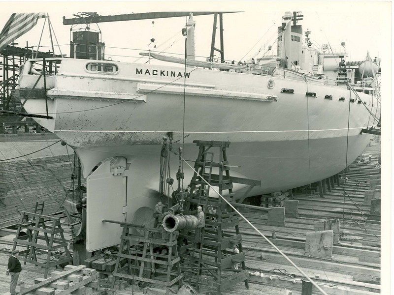 MACKINAW was built in Toledo, Ohio at a cost of ten million dollars. The keel was laid on March 20th, 1943 at the Toledo Shipbuilding Company, which had won the contract. Various delays in completion involved such heavy penalties that the firm was forced into bankruptcy and the contract was taken over by the American Shipbuilding and Dry-dock Company. The hull was launched March 4th, 1944 and MACKINAW was commissioned on December 30th, 1944. Cheboygan remained her home port her entire life.